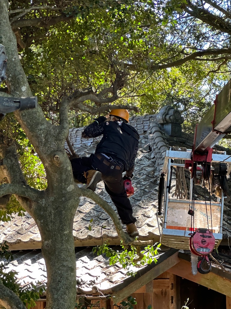 梅原林業では高木、巨木、建造物に近い大木の伐採をしております。電線にかかってしまった枝なども剪定しております。